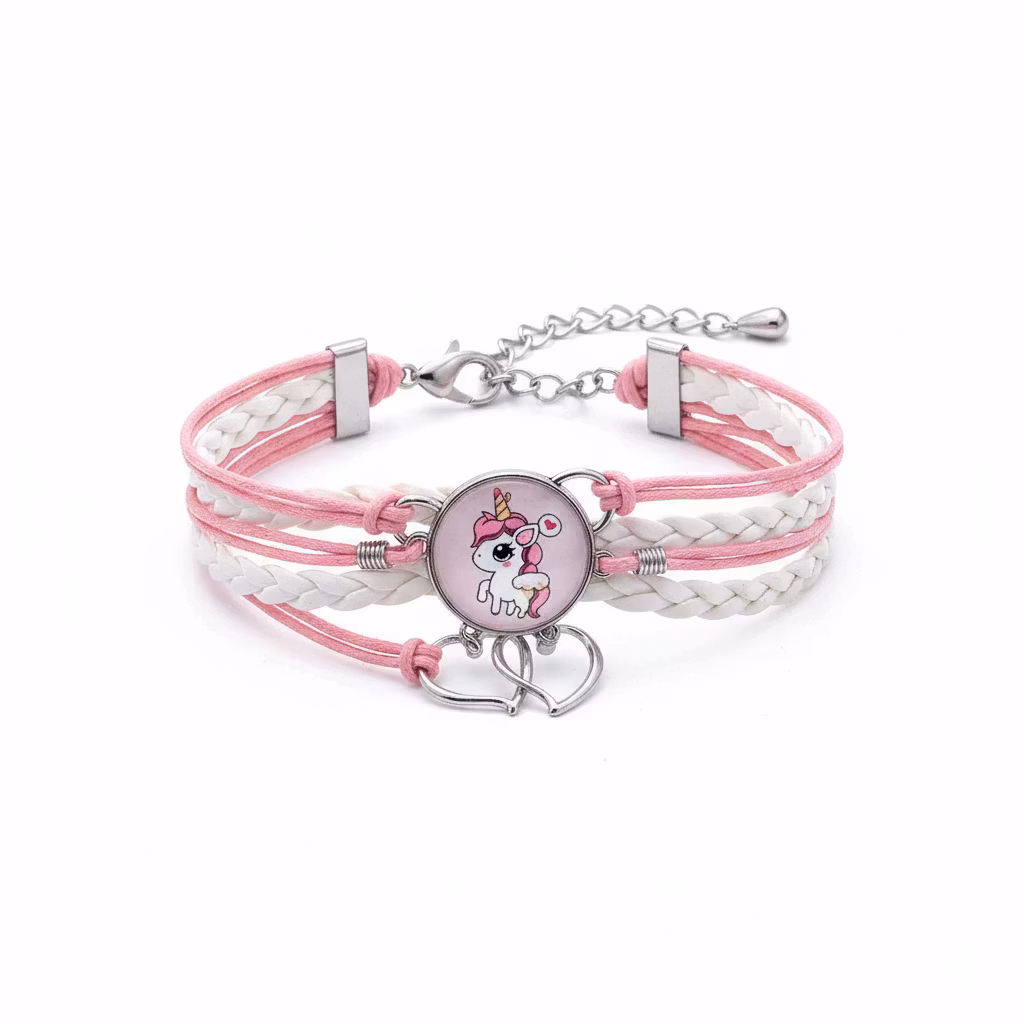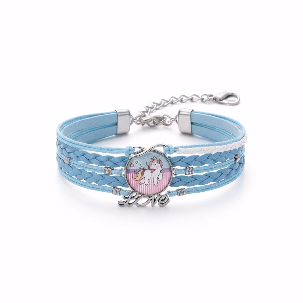 Ett barnarmband med enhörningsmotiv. Armbandet har flera band i olika mjuka färger och en liten detalj med texten love. Passar barn som tycker om enhörningar och vill bära ett färgglatt och bekvämt smycke till vardagen. Ett fint val vid födelsedag, namnsdag eller som en liten överraskning.