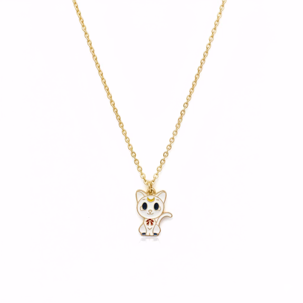 Ett stilrent och barnvänligt halsband med en söt kattberlock, perfekt för barn som tycker om djur och vill ha ett enkelt men charmigt smycke i vardagen. Den guldtonade kedjan och de mjuka färgerna gör halsbandet lätt att kombinera med olika kläder och bära både i skolan och på fritiden.
