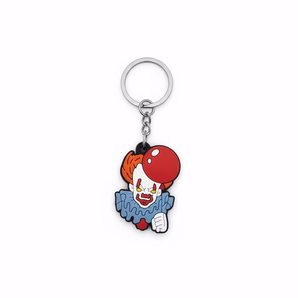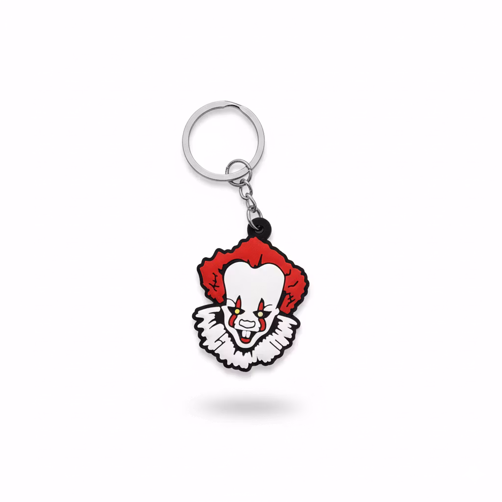 En detaljerad nyckelring inspirerad av den ikoniska skräckgestalten Pennywise från Stephen Kings värld.